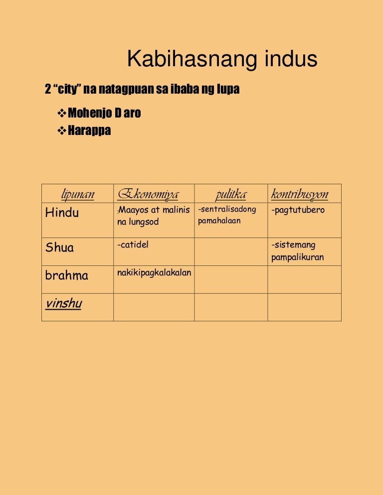 Sumerian 5300-2334 BC Unang kabihasnang nabuo sa Mesopotamia. Sistemang Pampulitika at Pang-ekonomiya 3. Jan 01 2009 KABIHASNANG INDUS Heograpiya Pamahalaan Ekonomiya Relihiyon Uri ng tao Mga ambag sa Mundo SlideShare uses cookies to improve functionality and performance and to provide you.