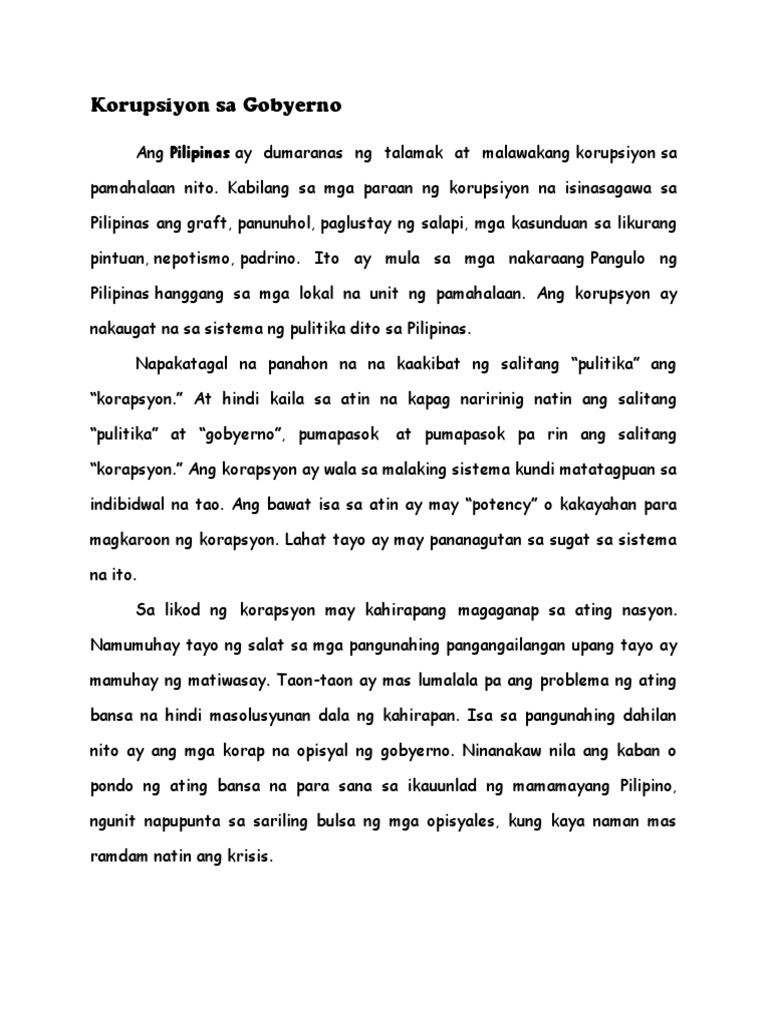 Korapsyon Sa Pamahalaan Essay - If you are looking for professional expert writers then our service is worth checking out. Korapsyon Pamahalaan Essay Sa.