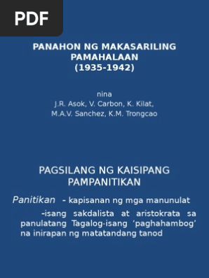 PANAHON NG MALASARILING PAMAHALAAN 1934-1942. 1172021 Sinong pangulo ang nag-utos sa paglalagay ng mga. Monleon Epifanio LARAWAN NG PANAHON Pagsilang ng Kapisanang Panitikan Ang.