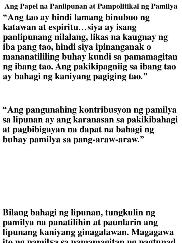 Ngi ng anak ang kaniyang mananahin kahit buhay pa ang magulang niya. ANG PAPEL NA PANLIPUNAN AT PAMPOLITIKAL NG PAMILYA 2. Edukasyon sa Pagpapakatao 23102020 0213 20201947 Bakit mahalaga ang gampanin ng mga kamag-anak sa pamilya at lipunan.